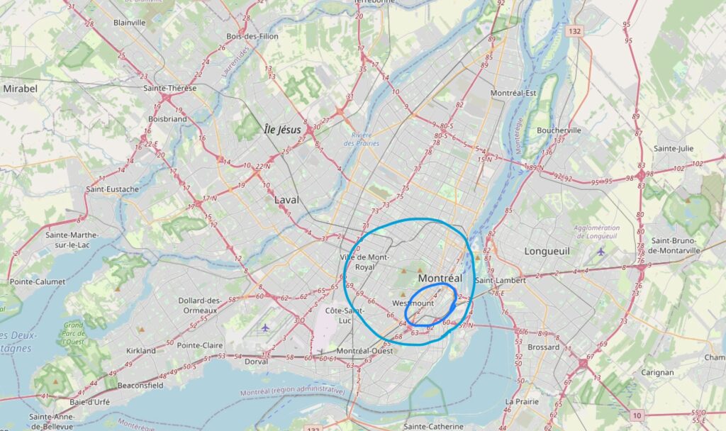 イメージですが、街の真ん中に「モン・ロワイヤル山」があり山を囲むように街があります(紫色)。そしてダウンタウンと呼ばれる中心部が赤線です