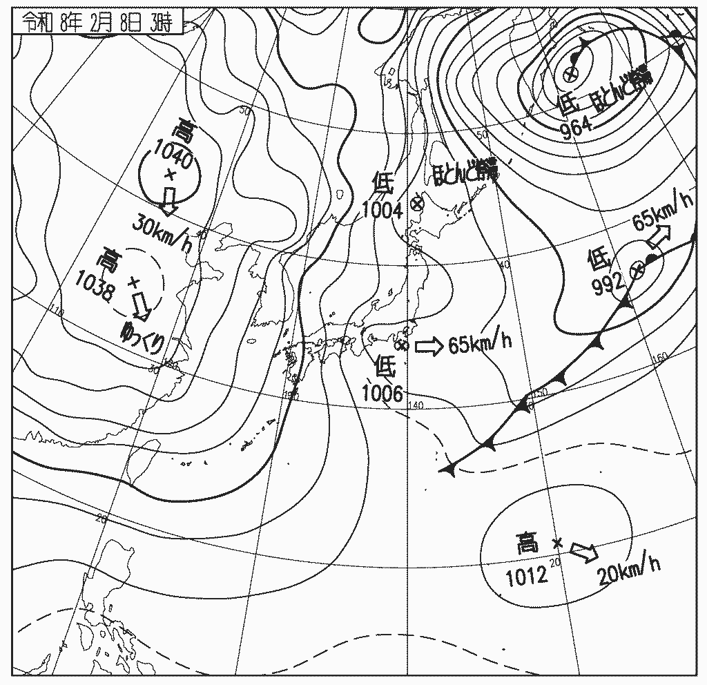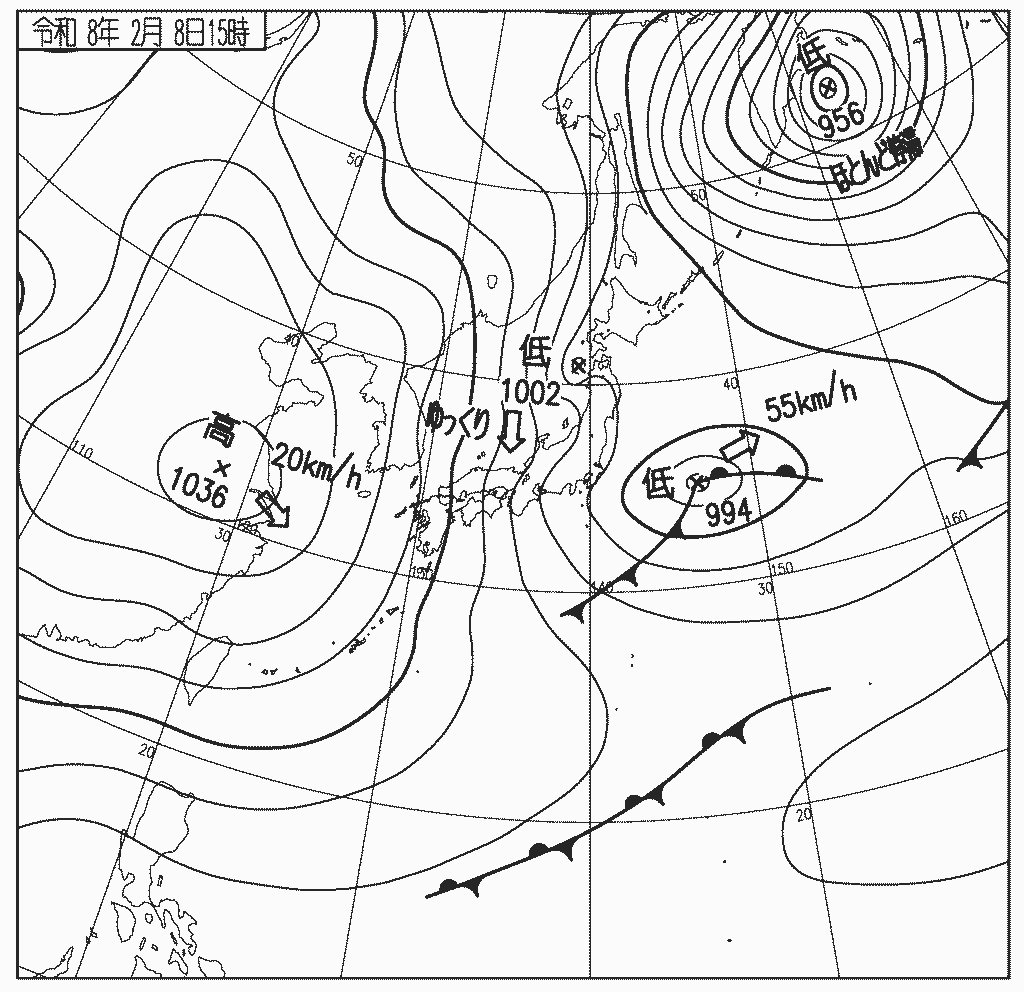 3時間後の8日15時、低気圧は前線を伴い日本の東海上に抜け西高東低の気圧配置に戻り冬型が強まる