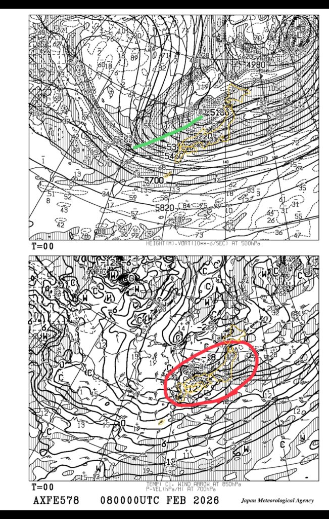 出典:専門気象情報 地球気 上図[AXFE578] 極東850hPa気温・風/700hPa上昇流の拡大図)
