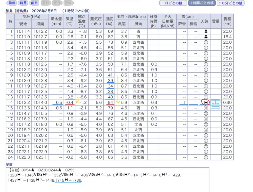 これは徳島県徳島市の地上気象観測であり、わたしの住む鳴門市は北へ約15km離れており少し違いがある。徳島では「雪」を観測しているが鳴門市では「あられ又はひょう」を目視で観測。