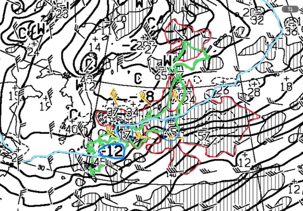 日本(緑)、上昇流域(赤:縦線)、風(黄色)、マイナス12度(水色)、そして関東に−45hPa/h、山陰に−17hPa/hの上昇流が強いところがある。