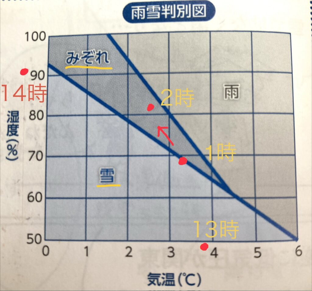 未明にみぞれ。それから降水が無く、朝にかけ湿度が下降。昼前あたりで気温は4.4度まで上がったが11時に最低湿度34%を観測、その結果、雪が融解せず降雪。