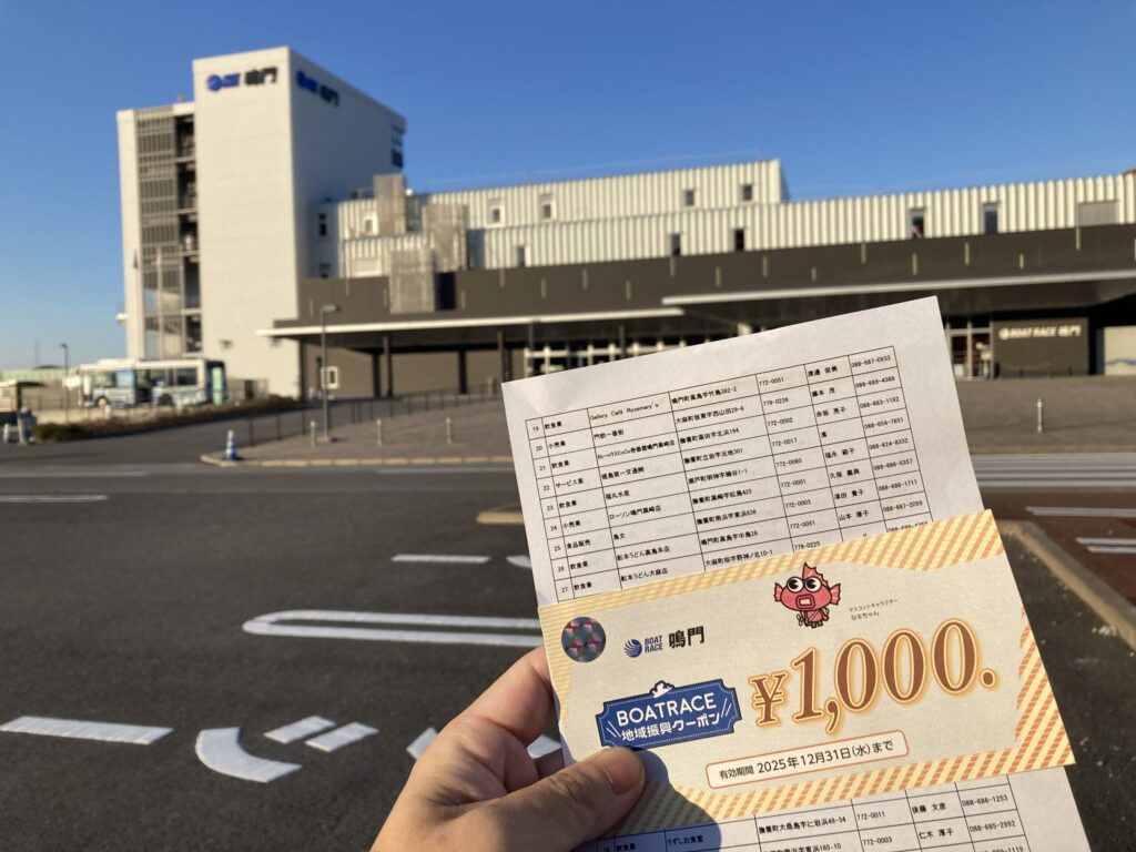 そういえば、ボートレース場に入場したとき1枚抽選券をもらいガラガラを回し、ハズレ?なのか地域で使える1000円分の商品券が当たった。